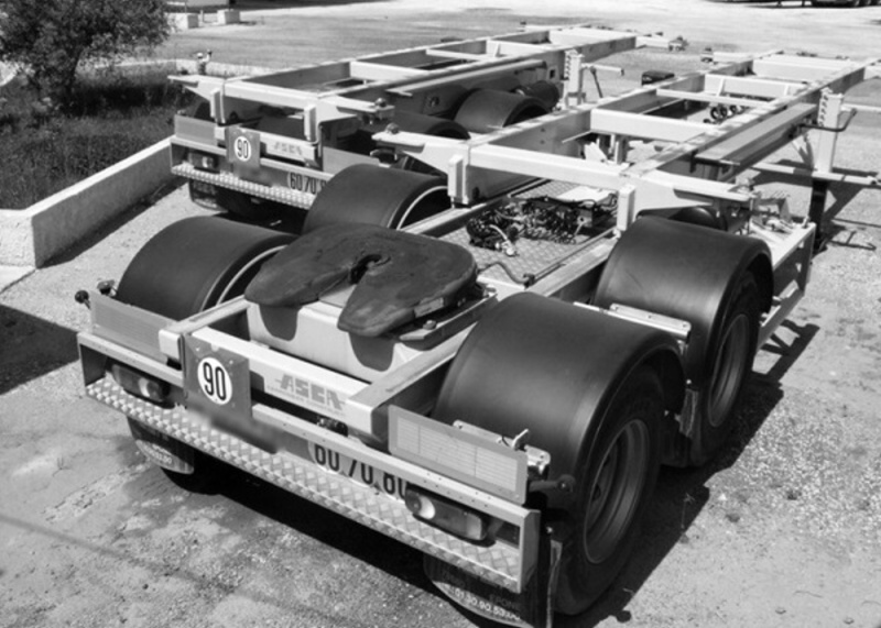 Der 1. Auflieger ist hier auch teleskopierbar, siehe die Laufspuren auf den Rahmenlängsträgern. Die 90-km/h-Schilder weisen auf einen französischen Ursprung hin.