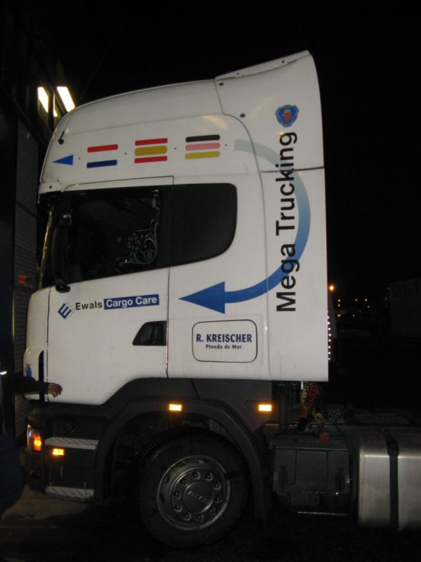 Hier mal nen Bild von "meinem" MAN in der Zona Franca in Barcelonagroßes Grinsen Das erste Auto scheint vom Robert Kreischer ein Scania 4er Serie zu sein, der jetzt für Ewals in Tegelen zieht.