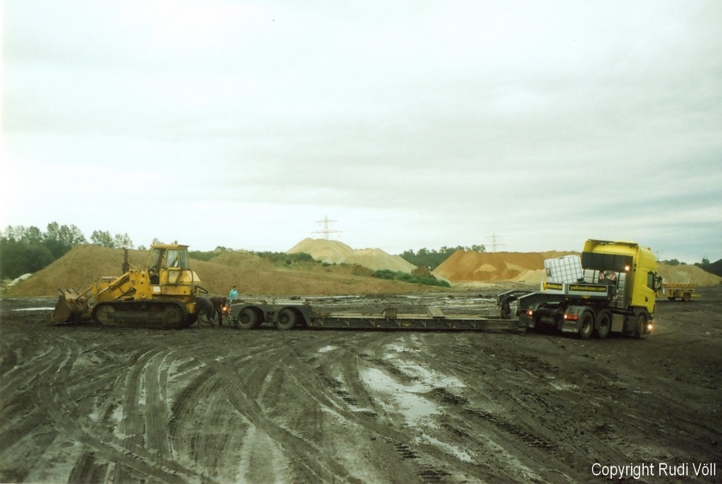 Noch ein Bild zum Thema Traktion. Der Scania R500 Tiefladesattel kam am Freitag Nachmittag aus der gezeigten Position aus eigener Kraft nicht mehr vor oder zurück, sondern rutschte über die durchdrehenden Antriebsachsen seitlich weg. Da musste dann die Cat 955H Laderaupe die nötige Traktion liefern.