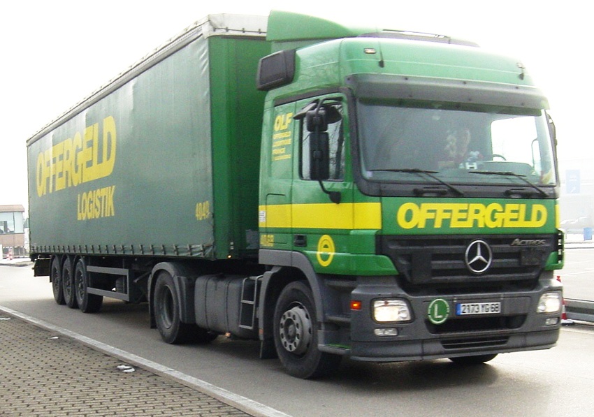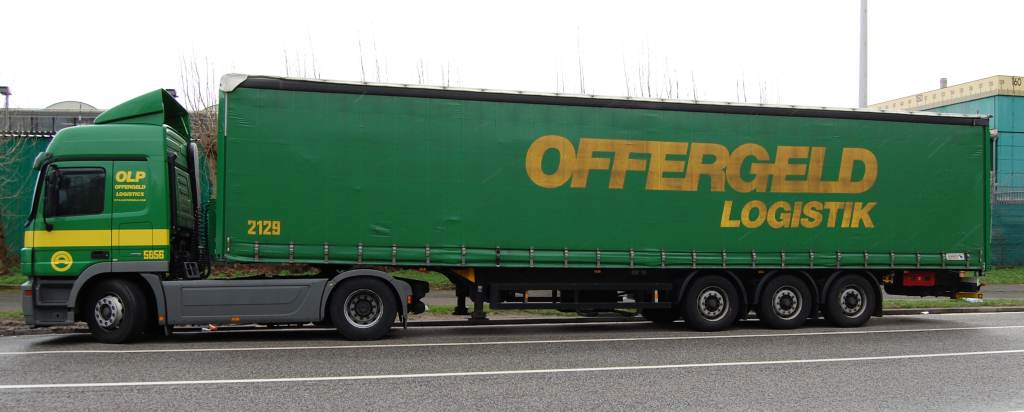 Daß ein Offergeld-LKW nicht immer grün sein muß, beweist dieses Bild eines Innenlader-Sattelzuges, den ich im Februar 2011 im Kreisverkehr an der A44-Auffahrt Broichweiden fotografiert habe. Gerade kam auch noch einer im üblichen grün von der Autobahn. Man sieht also, daß man nur etwa 2 km vom Offergeld-Nest ist