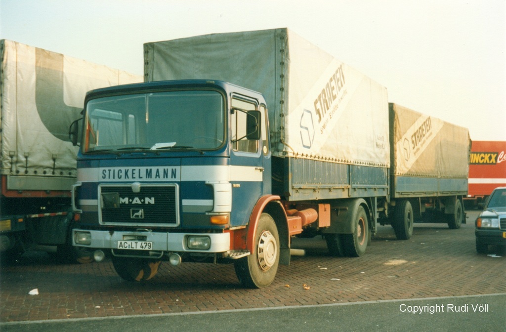 Immerhin schon gut 20 Jahre her ist es, daß ich diesen "Rennwagen" am Autobahnzollamt Aachen-Nord fotografiert habe (Januar 1992). Der 16168 Pritschenzug von Stickelmann aus Würselen hatte die anstrengendste Etappe aber schon hinter sich, nämlich vom Autobahnkreuz Aachen zur Grenze den Berg rauf Pfeifen