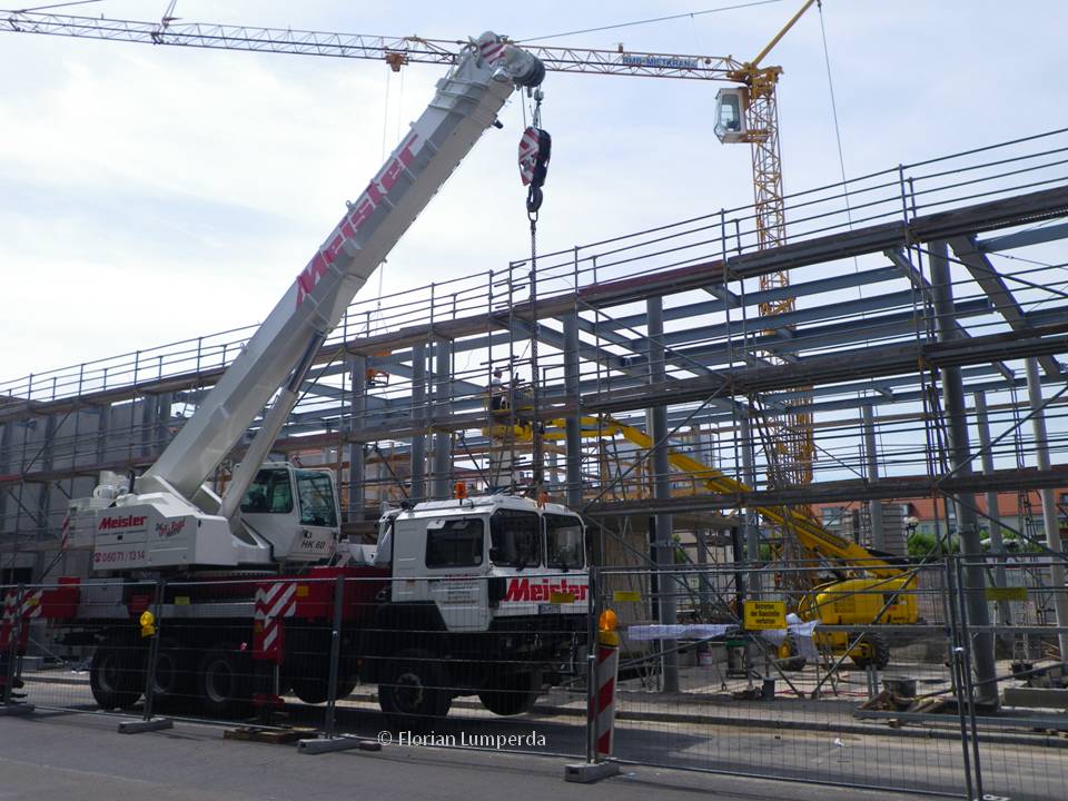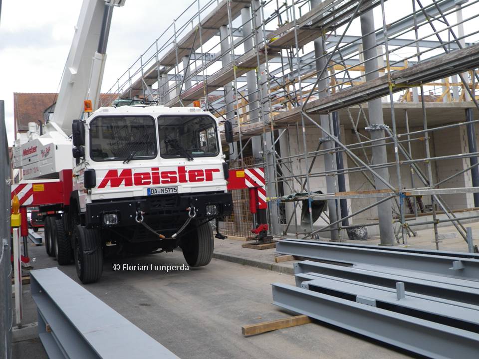 Der selbsternannte "Off-Road Meister" gehört zur bekannten Firma Meister aus dem hessischen Dieburg und ist dabei, Stahlbauteile für ein Gebäude einzuheben.