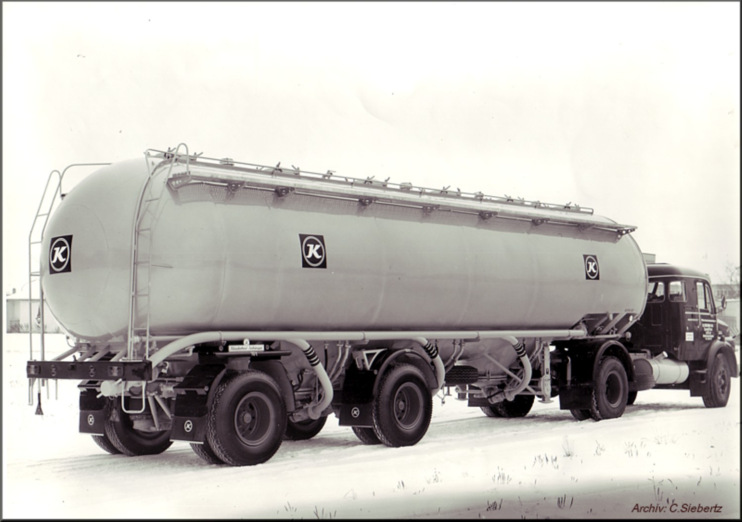 Es zeigt einen der ersten beiden Siloauflieger die 1967 speziell für den Transport von Braunkohlenstaub geliefert wurden. Als Zugmaschinen fungierten damals ein Scania L76 sowie dieser Mercedes-Benz LS 1620 mit Wackenhut-Kabine.