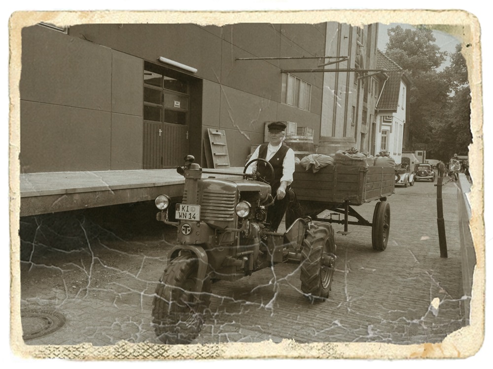 Der Baggerführer muß einige Kohlen nachlegen und ein Bauer bringt seine Milchkannen zur Meierei.