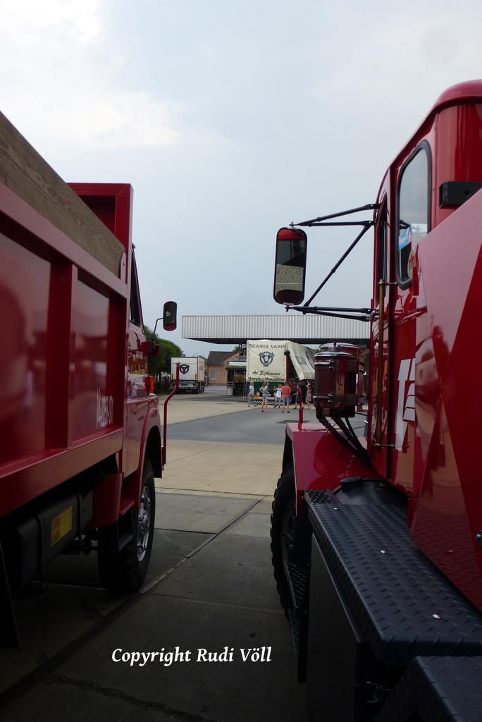 Na ja, der Firmengründer - mittlerweile über 80 - hat halt seine Firmengeschichte auf diese Weise verewigt. Die allermeisten dieser LKW sind nämlich nicht irgendwie dazugekauft, sondern früher einmal aktiv in seiner Firma im Einsatz gewesen.