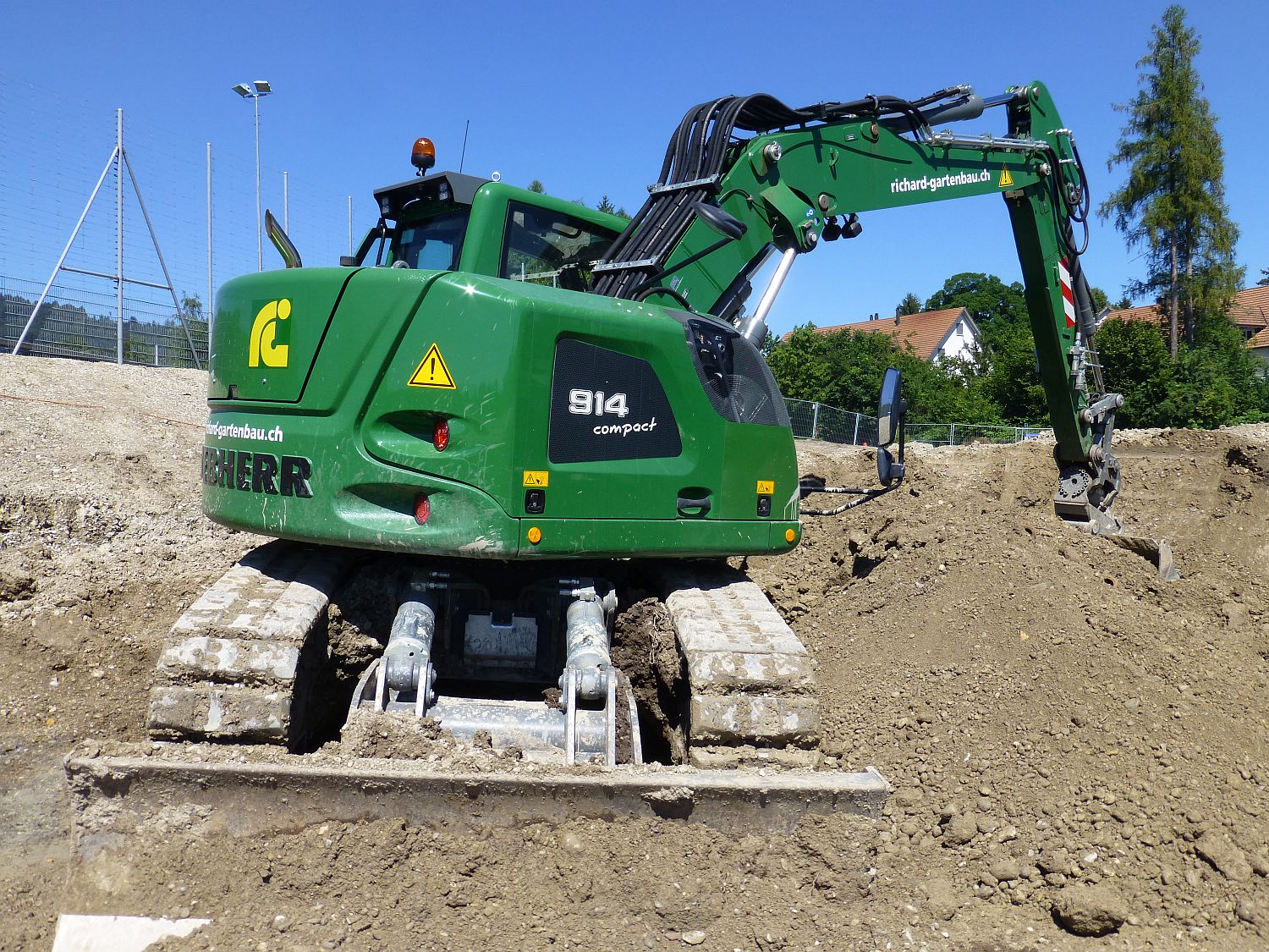 Liebherr R 914 Compact bei uns im Dorf auf einem Pferdehof. Mietbagger vom Michael Welte Mietpark.