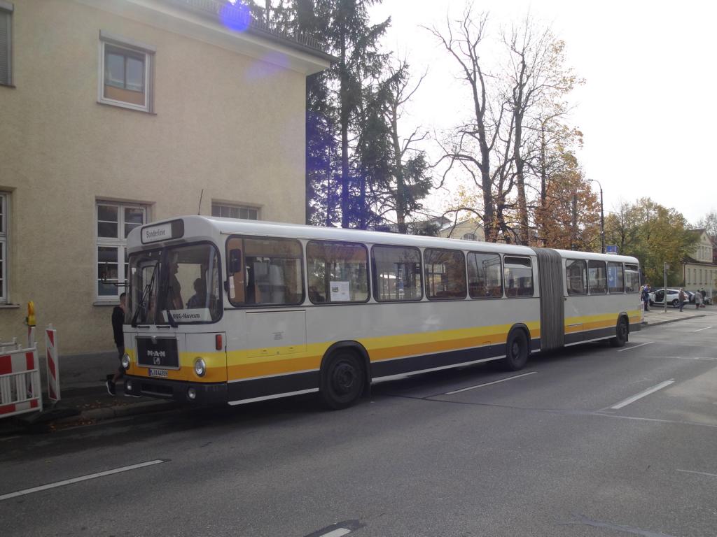 Zum Schluss noch weitere Bilder von der Shuttle-Linie mit Münchner Linienbussen aus drei Generationen: MAN SL 200 von 1980, MAN 890 UG 16A von 1965 und Mercedes O 405 GN "1,5" von 1993 ("1,5", weil "Zwischending" zwischen Original-GN und dem GN 2: Türseite Fensterlinie vorne tiefer, linke Seite aber gerade durchgezogene Fensterunterkante wie beim Original-GN. Eine Münchner Besonderheit, siehe auch den gestern geposteten MAN SL 202).