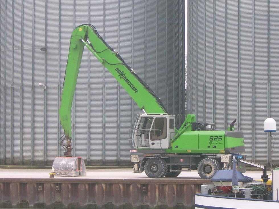 Er hatte die gleiche Auslage(Arm+Stiel), jedoch ein 4m³ Greifer dran. Bei einer Trichterversorgung lag er immer bei ca. 650-700 Tonnen/Stunde. Heißt am Anfang bei 5 Ladespielen beim abgreifen der Schiffe, dann ziemlich bis zum Ende bei 4 Ladespielen, selten bei 3 Ladespielen, bzw. erst bei dem putzen vom Schiffsboden.