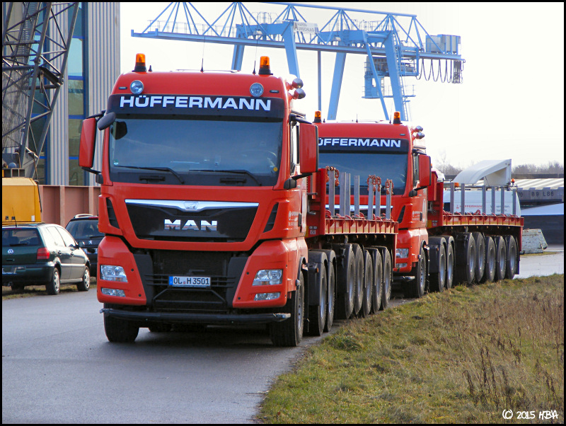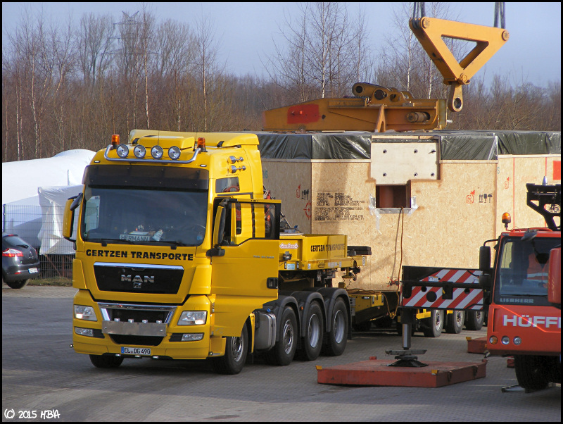 Die Kisten wurden mit Hilfe eines MAN TGX 41.540 mit Noteboom Tieflader der Firma Gertzen Krane u. Transporte GmbH & Co. KG aus den Hallen der Robert Nyblad GmbH gefahren.