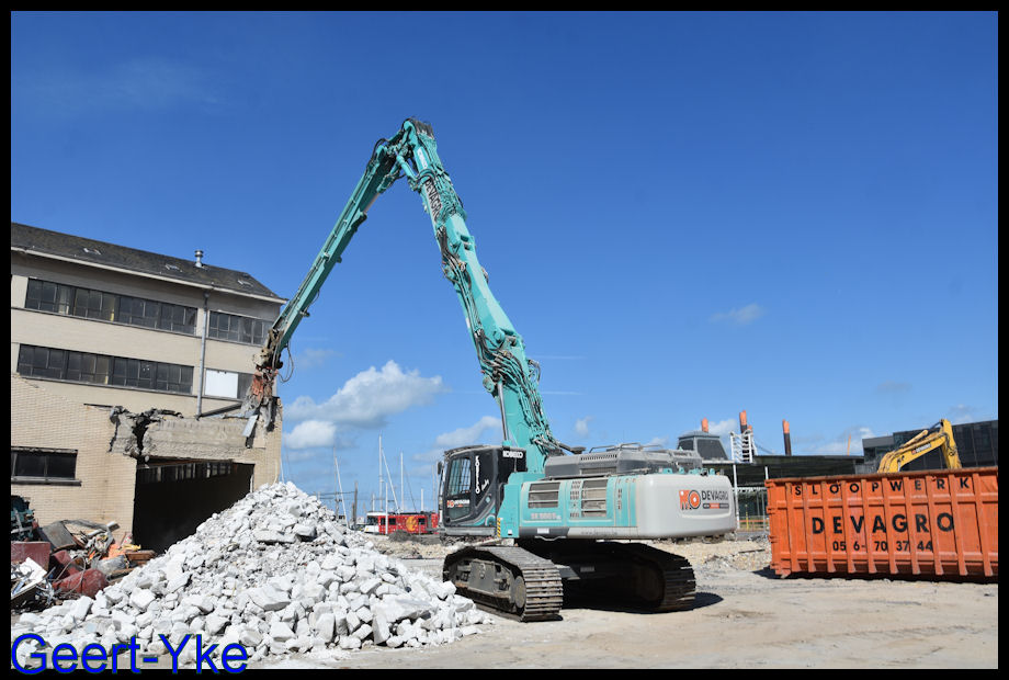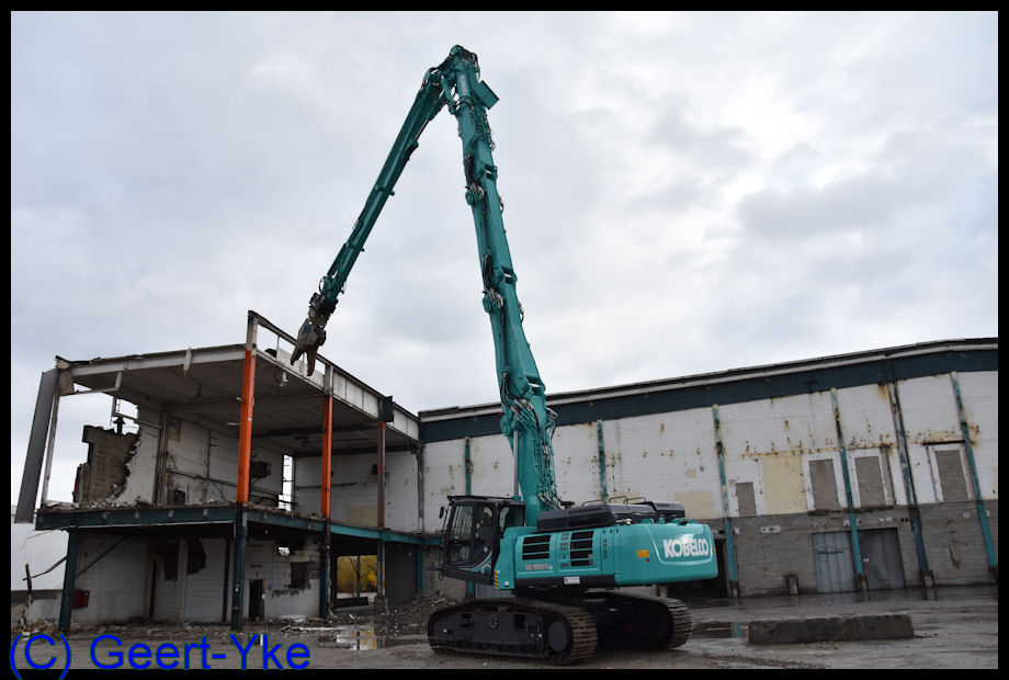 Der Kobelco SK 550DLC-10 Longfrontbagger von Devagro NV. Im einsatz mit neue NPK SV-250 Abbruchzange.
