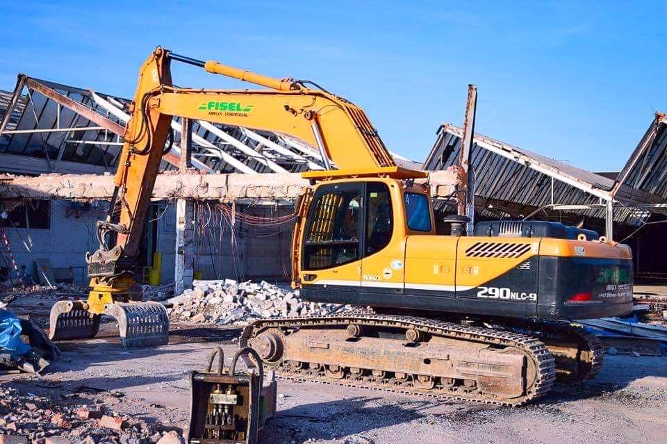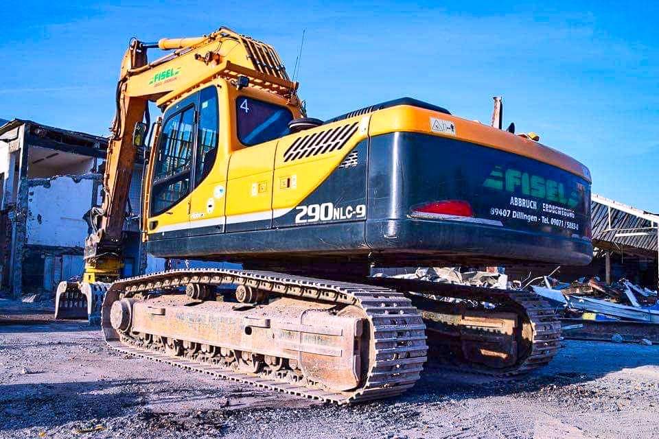 Abbruchbagger Hyundai 290 NLC-9. Dank des breit aufgestellten Maschinen- und Anlagenfuhrparks kann Fisel beim Thema Abbruch für Privat- und Industriekunden alles aus einer Hand anbieten.